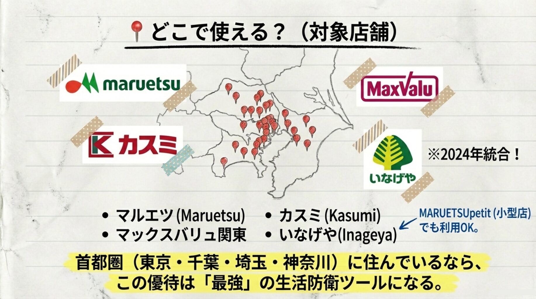 マルエツやKASUMIを日常使いしている家庭にとっては、まさに“現金感覚”で使えるありがたい優待です。