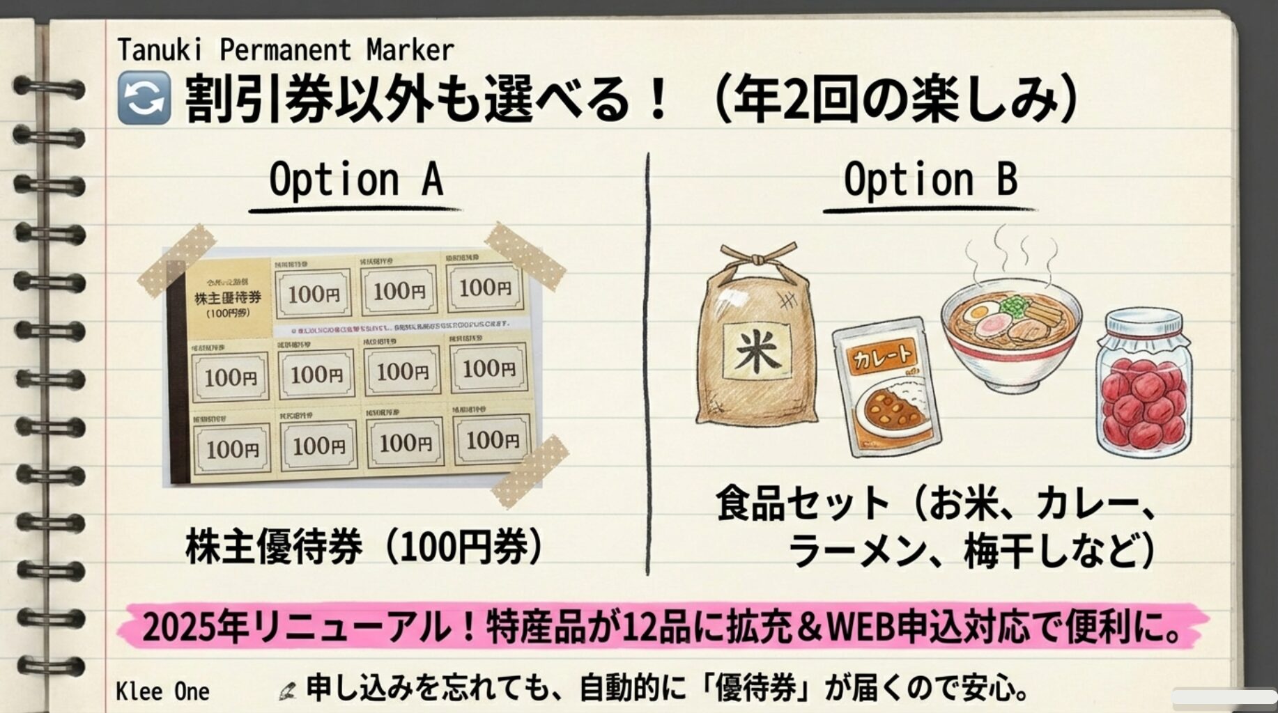 「割引券」か「食品セット」かを年2回選べるのが大きな特徴です。